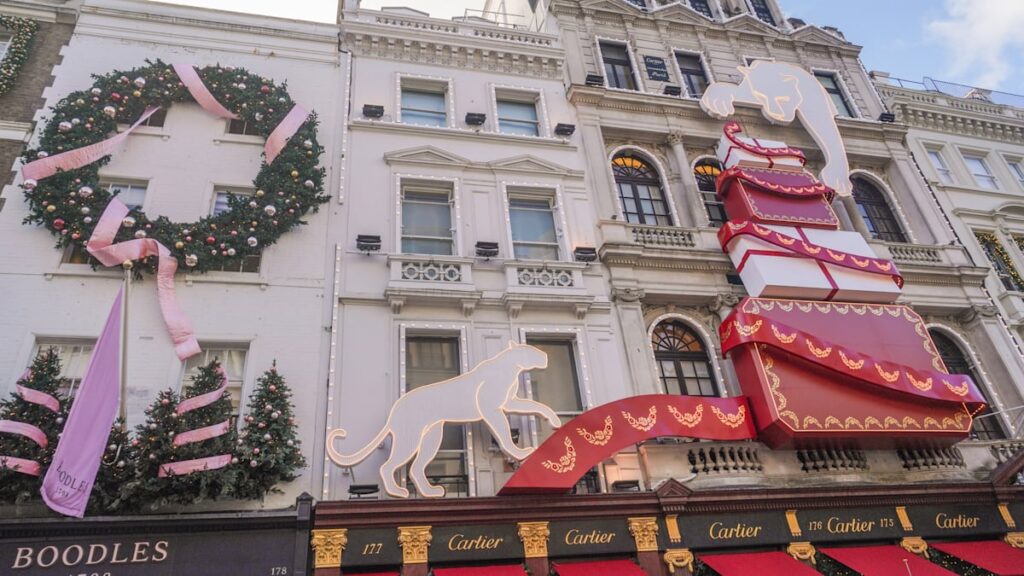Passanten und Besucher drängen sich über die schmalen Gehsteige, durch die Straße, die Jahr für Jahr mit der beeindruckendsten Weihnachtsbeleuchtung der Stadt fasziniert. Vorbei an Louis Vuitton, das dreistöckige Stadthaus aus georgianischer Zeit, geschmückt mit großen goldenen Sternen im Stil des Logos, bis zur üppigsten der diesjährigen Dekorationen. Vier stilisierte, übergroße, leuchtende Geschenkkartons prangen in den oberen Stockwerken vor Cartier, von zwei Seiten von Panthern eingerahmt, dem Symbol der exklusiven Marke.