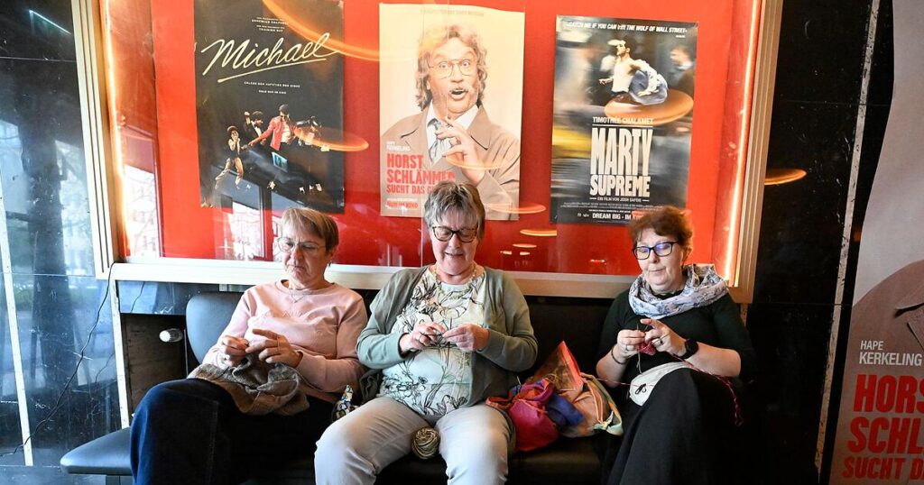 Bevor der Film startet, wird im Residenz-Kino erst mal munter geplaudert. Es geht um Strickmuster, neue Techniken, weitere anstehende Strickevents. Herma (59) aus Krefeld ist begeistert: „Ich stricke gerne in Gesellschaft und bekomme hier viele schöne Tipps.“ Auch ihre Freundin Regina arbeitet im Foyer schon fleißig an ihrem Pullunder, bevor es in den Saal geht.