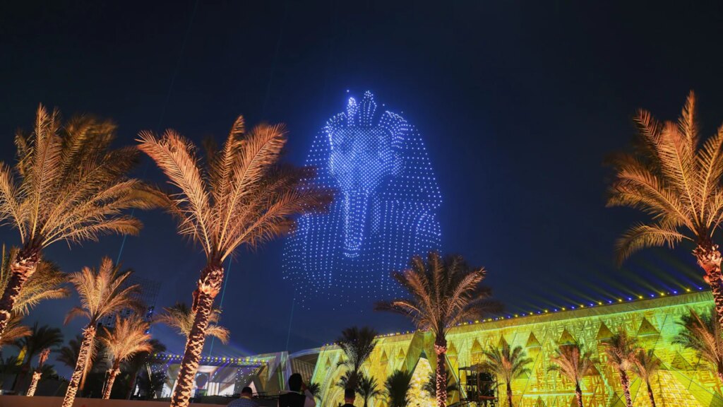Pompös: Mit einem Festakt ist am Samstag in Gizeh das Große Ägyptische Museum eröffnet worden. Zu sehen gibt es rund 100 000 antike Exponate, darunter auch den Grabschatz des Pharaos Tutanchamun, dessen Totenmaske hier in den Nachthimmel projiziert wird.