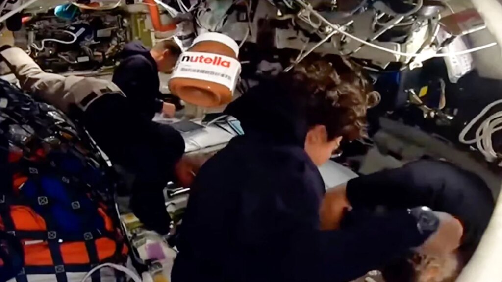 Kurze Zeit später ging ein Clip auf Social Media viral, der aus dem Nasa-Livestream der Artemis-2-Mondmission stammt (Nasa heißt: National Aeronautics and Space Administration). Darin ist zu sehen, wie in der 55. Minute des Official-Broadcast-Videos der Nasa durch die Orion-Raumkapsel augenscheinlich das Glas einer bekannten Nuss-Nugat-Creme fliegt.