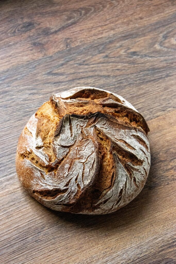 Der Teig wird nur mit Sauerteig und Hefewasser gelockert. Es bleibt dank des Brühstücks aus Altbrot lange saftig und ist herrlich komplex im Geschmack.