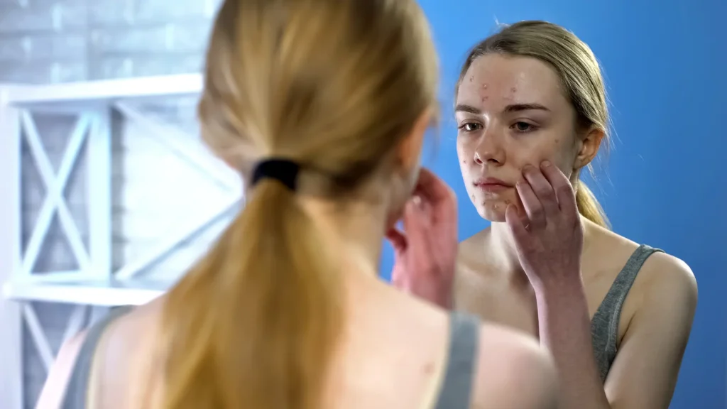 Eine junge Frau mit Akne im Gesicht betrachtet sich kritisch in einem Spiegel. | Colourbox, Ievgen Chabanov
