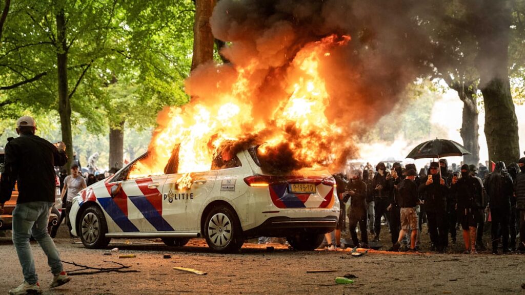Ein Polizeiauto sei in Brand gesetzt worden. Die Sicherheitskräfte hätten daraufhin Wasserwerfer gegen die Randalierer gerichtet. Etliche seien festgenommen worden. Nach Angaben des Senders NOS schwenkten einige Demonstranten orange-weiß-blaue sogenannte Prinzenflaggen, die einst der National-Sozialistischen Bewegung (NSB) der Niederlande als Symbol dienten und heute von Rechtsextremisten verwendet werden.