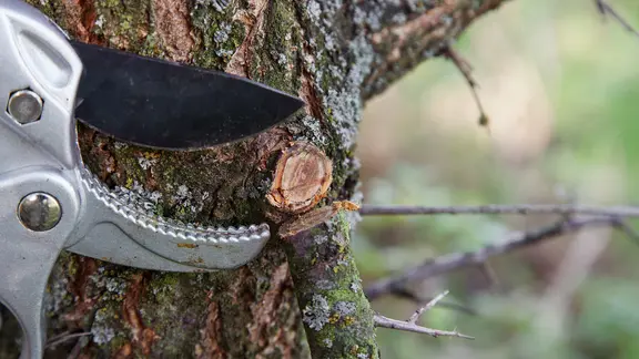 Ein Ast wird mit einer Gartenschere von einem Baum abgeschnitten