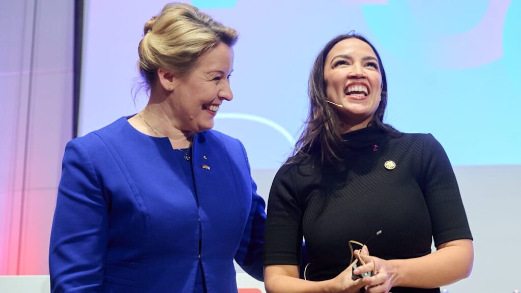Das gelte auch in Bezug auf den Gaza-Krieg – ein Thema, dass vielen im Publikum unter den Nägeln brannte. „Ich frage mich respektvoll, warum Sie gemeinsam mit der SPD, die maßgeblich Waffenexporte nach Israel ermöglicht hat, an dieser öffentlichen Veranstaltung teilnehmen“, wollte ein Zuhörer wissen, da Ocasio-Cortez regelmäßig „zu Recht den Völkermord in Gaza“ scharf kritisiere. Dass ausgerechnet Wirtschaftssenatorin Franziska Giffey (SPD) die Veranstaltung eröffnet habe, wirke „wie ein Versuch der SPD, ihr Image aufzupolieren und sich ihrer Mitschuld an diesem Völkermord zu entziehen“. Dies geschehe angesichts der bevorstehenden Berliner Oberbürgermeisterwahl, „bei der die Linke tatsächlich Chancen auf den Sieg hat“. Die Ansichten des Fragestellers teilten offenbar einige Anwesenden, erntete Giffey während ihres Grußwortes doch einige Buh-Rufe aus dem Auditorium.