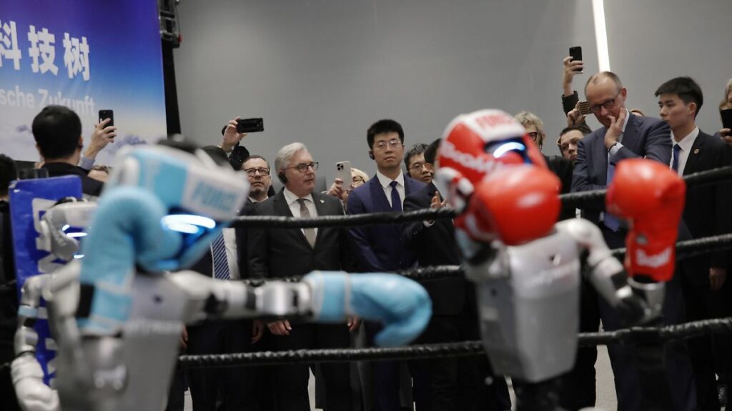 Mit verschränkten Armen steht der deutsche Kanzler vor dem Boxring, in dem zwei Roboter sich beharken. Merz hat den Kopf leicht gesenkt, mit verschmitztem Lächeln beobachtet er den Kampf, dann wird er weitergeführt. Friedrich Merz und seine 30-köpfige Wirtschaftsdelegation haben bei ihrem Besuch in der Millionenmetropole Hangzhou neben Hochspannungsanlagen von Siemens auch humanoide Roboter des chinesischen Unternehmens Unitree vorgeführt bekommen.