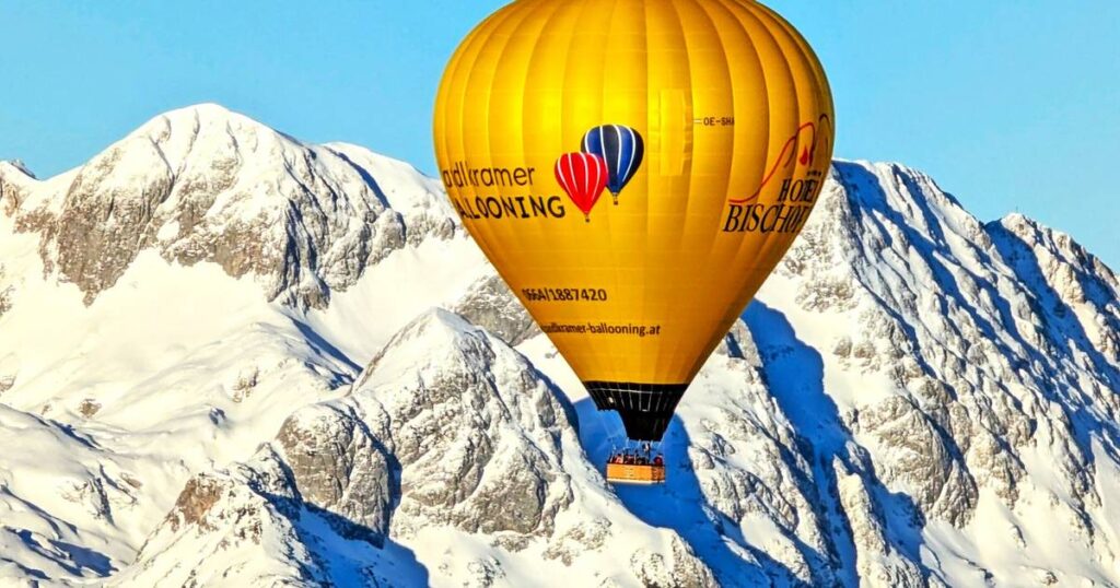 Eine Frostbeule sollte man nicht sein, wenn man im Winter mit einem Ballon fahren will. Bereits der kurze Fußweg vom Hotel bis zum Startplatz am Ortsrand von Filzmoos ist eisig. Dort herrscht der Kälte zum Trotz seit dem frühen Morgen reges Treiben. Bunte Ballonhüllen, die wie schlafende Riesen aussehen, liegen auf der verschneiten Wiese am Rand der 1500-Seelen-Gemeinde im Salzburger Land. Piloten und Helfer schleppen Gasflaschen heran und richten die Körbe auf. Leinen werden sortiert und Karabiner eingehakt. Immer wieder durchbricht das Fauchen der Gasbrenner die morgendliche Stille. Ein halbes Dutzend Ballons ist schon zum Einsteigen bereit – ein kleiner mit einem Korb, der sechs Personen aufnehmen kann, vier mittelgroße (zwölf Personen) und ein riesiger. Rund 30 Meter hoch ist seine Hülle. Bis zu 24 Personen können mit ihm durch die Lüfte reisen.