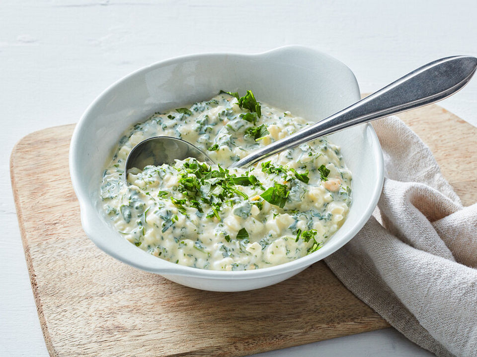 Damit sich der Kräutergeschmack richtig entfalten kann, sollte man die Grüne Soße vor dem Servieren für mehrere Stunden zugedeckt in den Kühlschrank stellen.