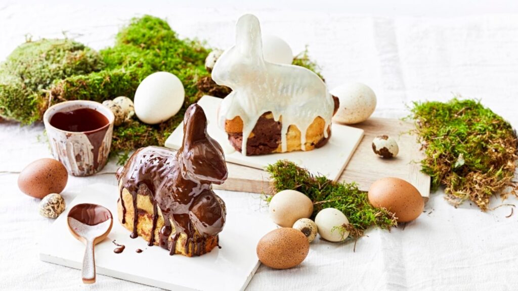 Zu Ostern gibt es oft den ersten heimischen Rhabarber. Deshalb findet in vielen Familien ein fruchtiger Rhabarberkuchen, Rhabarberkuchen mit Baiser oder Rhabarberkuchen mit Streuseln den Weg auf die Kaffeetafel. Auch österlich verzierte Rhabarbermuffins kommen gut an.