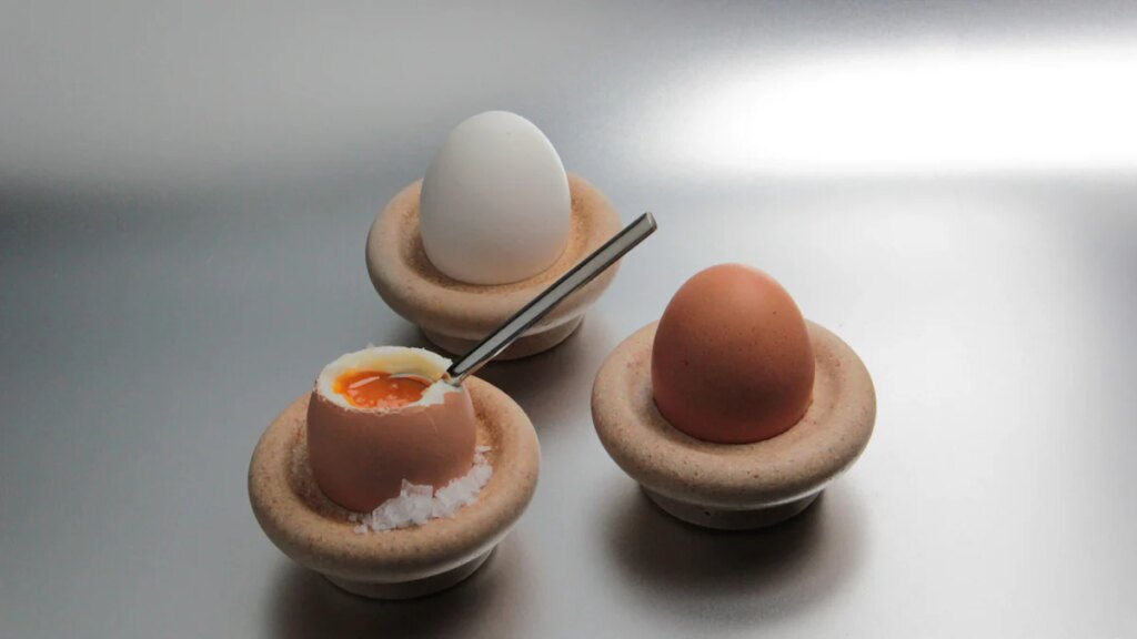 Obwohl Eierbecher zu den kleinsten Formaten in Sachen Geschirr gehören, holen Designer traditionell viel aus ihnen heraus. Die aus der Bernadotte-Kollektion von Georg Jensen sind legendär, beim „Cico“ von Alessi gehören sogar gleich Löffel und Salzstreuer dazu. Die beste Neuentdeckung kommt aus Istanbul von Atelier Barb. Die beiden Künstler Safiye Ozkan und Haydar Bayindir arbeiten in ihren Designs viel mit Abfall und organischen Materialien. Ihre schlicht schönen „egg cups“ halten die Eier nicht nur, sie bestehen quasi auch daraus: Das braune oder grünliche Bioplastik wird aus einem Dutzend Eierschalen hergestellt. Das Material soll bis zu 15 Jahre lang halten, ist dann aber komplett biologisch abbaubar. Die Modelle „Petal“ oder „Orb“ hingegen sind aus upcyceltem Aluminium gefertigt und so geformt, dass sie sich nahezu endlos stapeln lassen, um dann kunstvolle Skulpturen zu bilden. Vorausgesetzt natürlich, man hat Verwendung für so viele Eierbecher in seinem Haushalt.