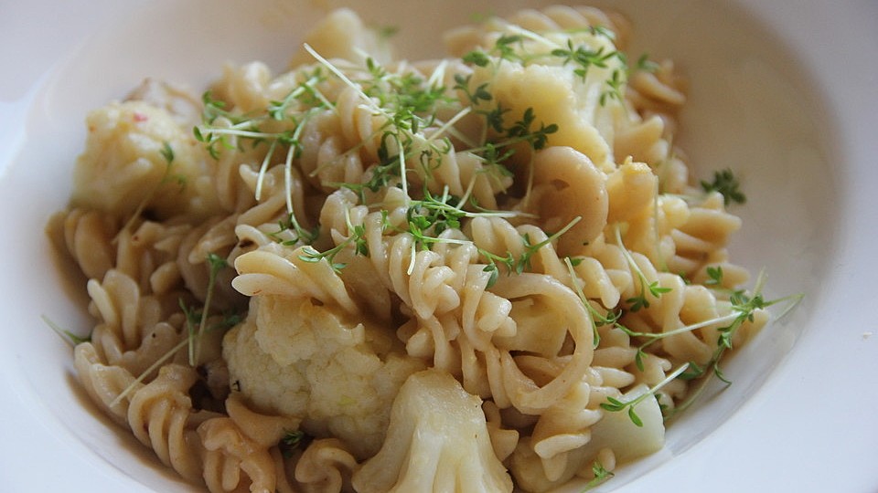 Nebenbei die Nudeln bissfest kochen, sobald sie al dente sind, in die Pfanne zu Kichererbsen und Blumenkohl geben.