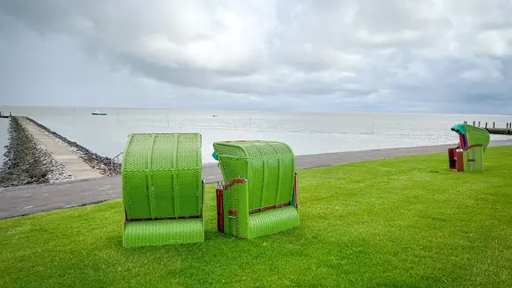 Grün bis an die Wasserkante – so präsentiert sich die drittgrößte Nordseeinsel, die vor allem auf sanften Tourismus setzt. Kleine Hotels, Pensionen und zahlreiche Ferienwohnungen erwarten die Urlauber auf Pellworm. Ein 28 Kilometer langer und acht Meter hoher Deich schützt die Insel vor den Fluten der Nordsee und bietet bei schönem Wetter als Strandersatz reichlich Liegefläche für Sonnenanbeter. Wer es gemütlicher mag, kann an verschiedenen Badestellen Strandkörbe mieten.