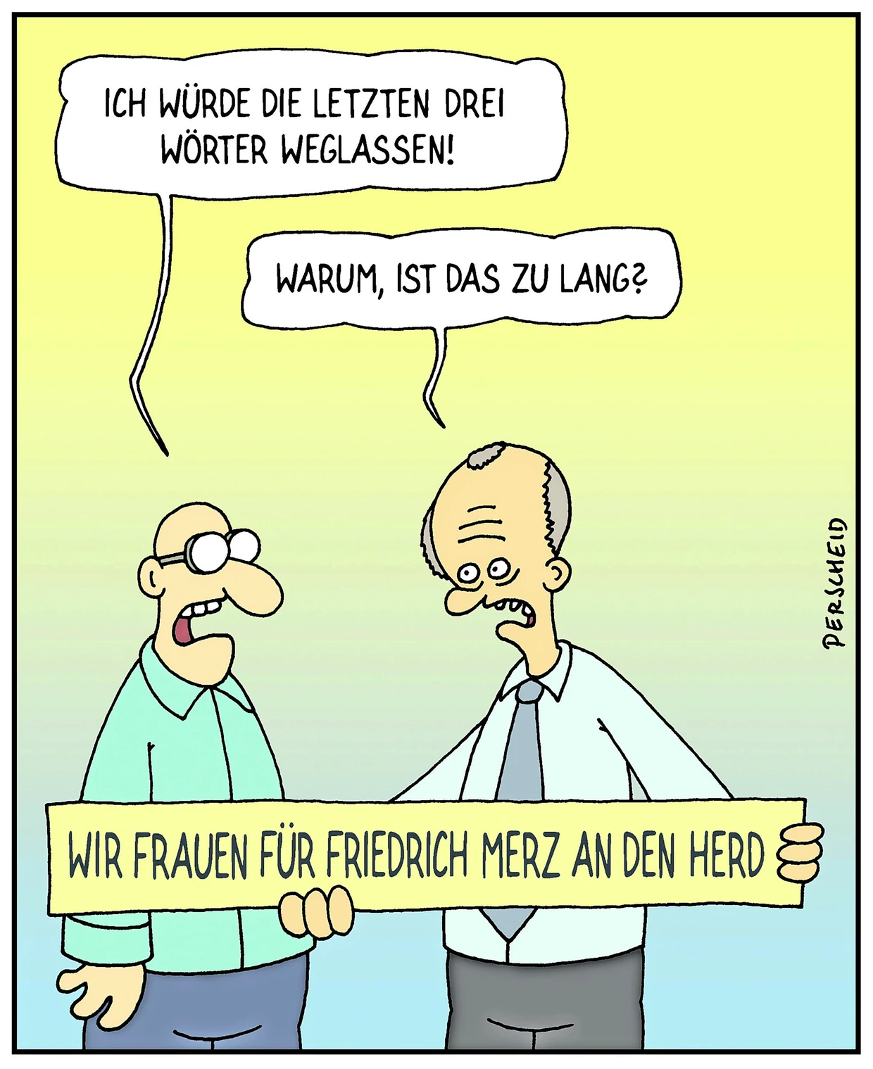 Einen der „größten, besten und bekanntesten Karikaturisten der Szene“ nennt Martin Sonntag ihn. Der Leiter der Caricatura hat Perscheid schon mehrfach ausgestellt, in Kassel und anderswo, und dem Künstler nach seinem Tod die Grabrede gehalten. Ausgerichtet hat er die Ausstellung rund um den 60. Geburtstag Perscheids am 16. Februar 2026. Eine „Ausnahmeerscheinung der Kunst“ nennt er ihn: „Er ist der Meister des Cartoons.“ Erzielt habe er seine oft knalligen Effekte durch bewusste Einfachheit, er zeige „Perfektion in der Reduktion“.