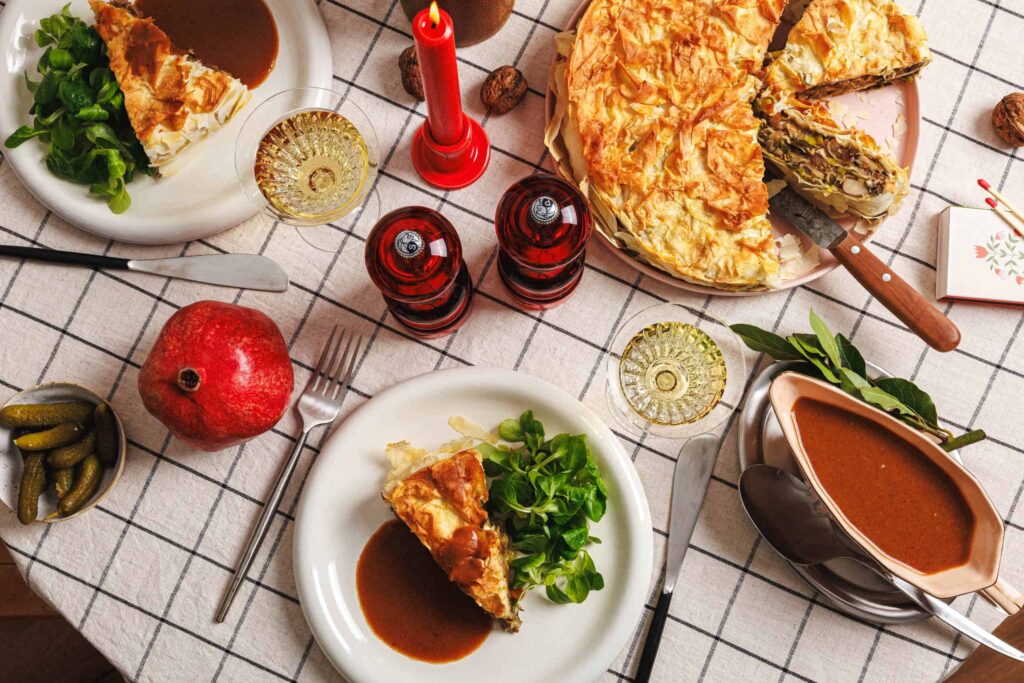 Aber nun zurück zum Pilzstrudel: So festlich – und vielleicht sogar aufwendig – er auf den ersten Blick wirkt, ist dieser Hauptgang, wie eigentlich alle unsere Menükomponenten über die Jahre, erstaunlich simpel vor- und zuzubereiten. An den Feiertagen ist ja so oder so schon genügend los. Wenigstens in der Küche soll es also für die Köche maximal entspannt und nervenschonend zugehen.