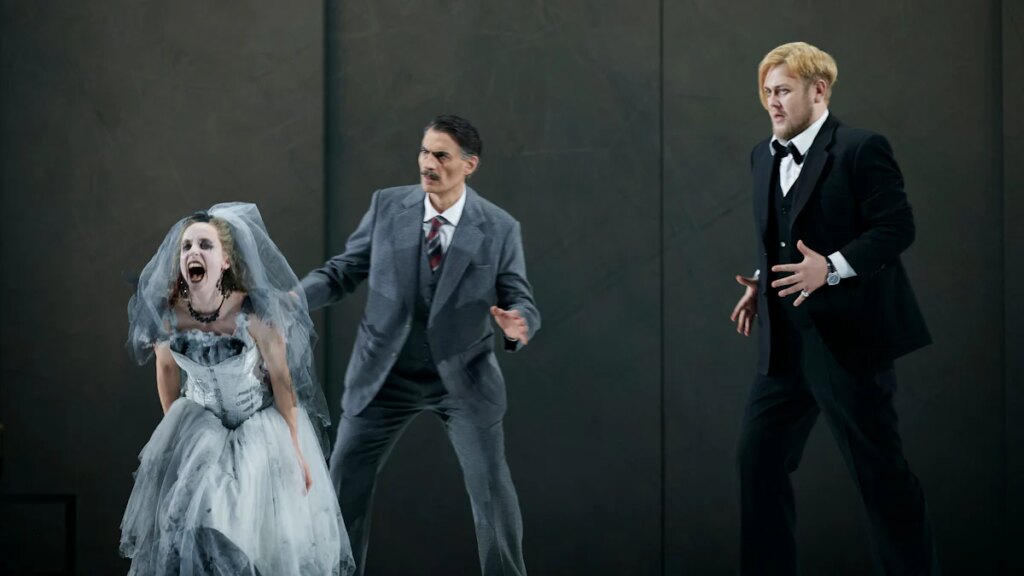 Es beginnt harmlos, das Brautpaar fährt auf Schlittschuhen herein, rechts und links zwei riesige Tafeln, jeweils zur Hälfte mit Hochzeitsgästen und, statt rüstigen Rittern, uniformierten Wachleuten besetzt – da wird man schon stutzig. Zu Recht, wie sich zeigen wird, denn später prügeln sie auf das queere Partyvolk in der U-Bahn-Station ein, inszeniert als gefrorener Augenblick, die Knüppel senken sich in Zeitlupe, als streichelten sie die zu Boden sinkenden Opfer. Das dämpft das unmittelbare Erschrecken. Das Motto des Abends bleibt dennoch die Chorzeile „Wozu Liebe, wozu Leid, wir leben, um fröhlich zu sein.“ Das klingt für die von Ratmir verlassene Gorislawa (große Stimme: Natalia Tanasii) gar nicht lustig. Ratmir wird von dem beeindruckenden Countertenor Artem Krutko verkörpert, der sich während des Gesangs aus seinem Anzug schält und in schwarzer Reizwäsche dasteht.