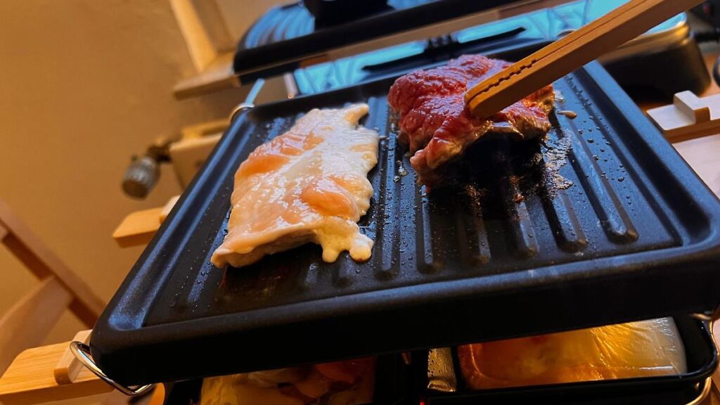 Das Gerät heizt bemerkenswert schnell auf: Nach etwa fünf Minuten ist die Grillplatte heiß, nach neun Minuten selbst ein dickes Stück Hähnchenbrust vollständig gar, das Rind ist sogar noch etwas früher fertig. Der Raclette-Käse ist bereits nach fünf Minuten goldbraun. Auffällig ist, dass die äußeren Käseränder heller bleiben – ein Hinweis darauf, dass die Pfännchen nicht immer tief genug unter der Heizspirale liegen.