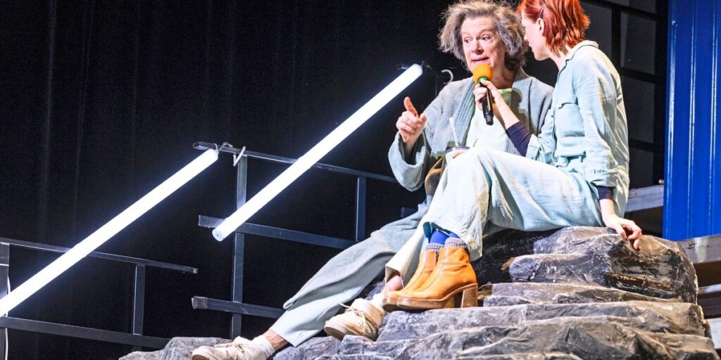 Im Kosmostheater ist die Welt ist am Untergehen. Es wird auf das Ende gewartet. Das letzte Jahr der unglücklichen Datinghistorie von „Menschheit“ und „Erde“ ist angebrochen, ein Seitensprung mit der Rakete zum Mars ist verziehen, aber die Menschheit hat „Raucherhusten“. Tapfer hält hier ein Paar Stellung und strickt Kleider mit ein bis acht Beinen – wer weiß schon, wie die nächste Spezies am Planeten aussieht. In Zeitkapseln soll sie auch Erinnerungen an uns finden. Ach, hätte man doch damals, als es das noch gab, Vogelzwitschern aufgenommen, reut es die dazustoßende Nachbarin. Im Radio (Bühne und Kostüme Michael Lindner) werden zwischen Stromblackouts noch einmal jedes Wort des Wörterbuchs vorgelesen und Hits gespielt, jeder ein letztes Mal.