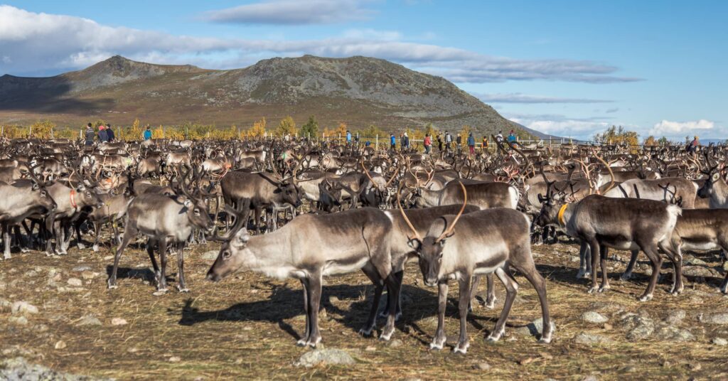 Die Herde rennt im Kreis, Kälber rufen nach ihren Müttern, Bullen schnauben. Tausend Rentiere drängen sich im umzäunten Sammelplatz hoch über Rensjön, einer kleinen Siedlung 200 Kilometer nördlich des Polarkreises in Schwedens nördlichster Provinz Norrbotten. Das Klicken ihrer Hinterläufe durchzieht die klare Herbstluft – ein Takt, der Orientierung gibt, wenn Nebel oder Schnee die Sicht rauben.