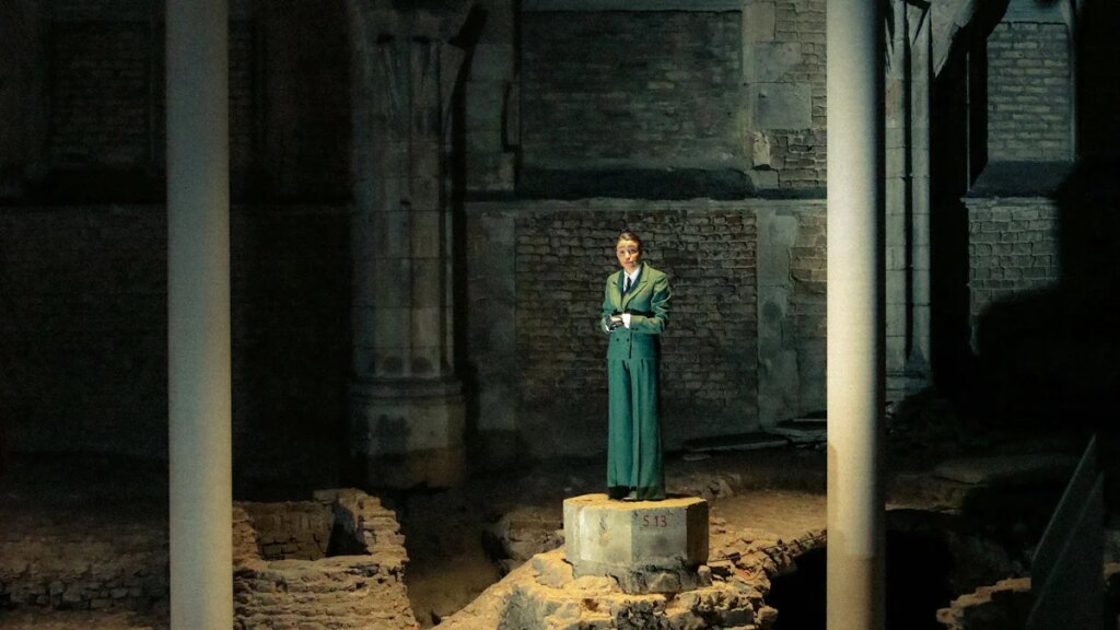 Ob er die Hallen Kalk kenne, fragt eine bebrillte Juristin den gotischen Schmerzensmann, der sich auf seinem Sockel von ihr abwendet. Das seien städtische Gebäude, die eigentlich der Kultur zur Verfügung gestellt werden sollten, erklärt die Frau, unbeirrt vom leidvollen Desinteresse der mittelalterlichen Jesus-Skulptur: „Die sind aber so marode, es gibt kein Geld, um die zu sanieren, es wurde auch nie Geld zurückgestellt im Haushalt.“