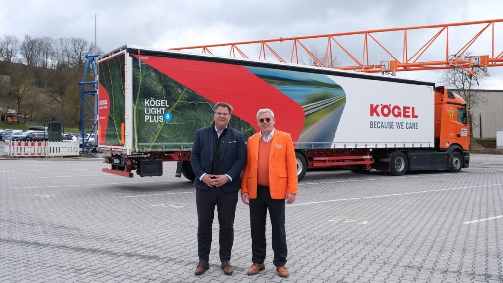 Sollte der Test positiv verlaufen, sieht Rüdinger gute Chancen für e-optimierte Trailer. „Wir können schon einige Leichtbau-Auflieger mit kürzerem Radstand in unserer Flotte gebrauchen, sofern der Preis stimmt“, sagt er. Dieser soll auf dem Niveau der herkömmlichen Kögel Light Plus-Trailer liegen“, sagt Kögel-CSO Thore Bakker, der das Fahrzeug persönlich an Roland Rüdinger übergab. „Die e-optimierten Trailer sind für Kögel ein wichtiges Produktsegment. Wir erwarten hier große Marktchancen und wollen uns mit Leichtbau und Premiumqualität vom Wettbewerb absetzen“, so der Vertriebschef.