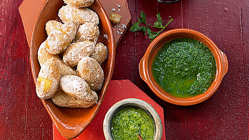 Die Kartoffeln waschen und in einem Topf mit stark mit Meersalz gesalzenem Wasser kochen. Die Kartoffeln müssen bedeckt sein. Um den richtigen Salzgehalt des Wassers festzustellen, soviel Meersalz auflösen, bis eine hinein gegebene Kartoffel nicht mehr auf den Boden sinkt.