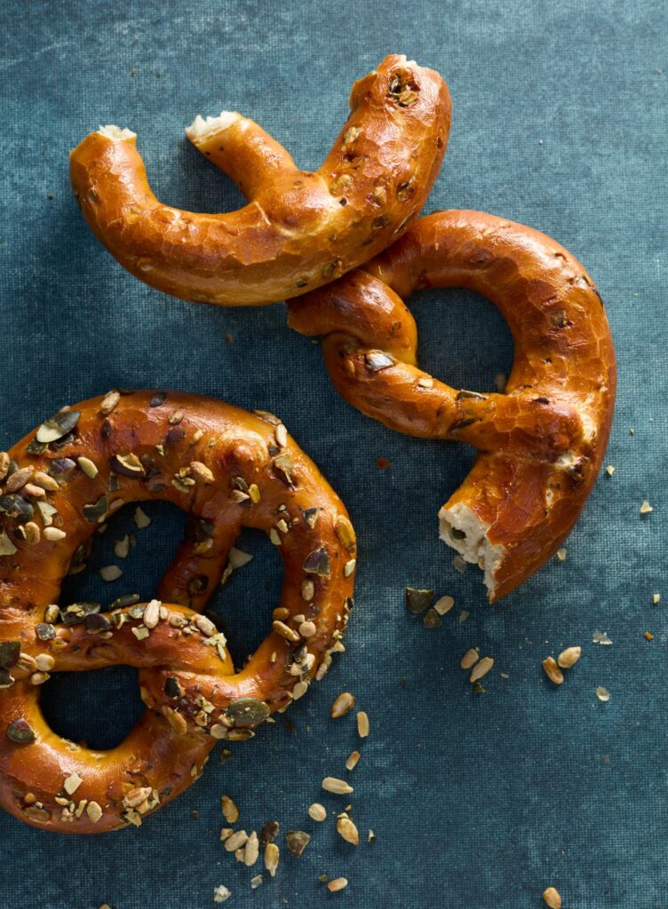 Geschmacklich besonders gut harmonieren Kürbiskerne und Sonnenblumenkerne mit Brezelteigen.