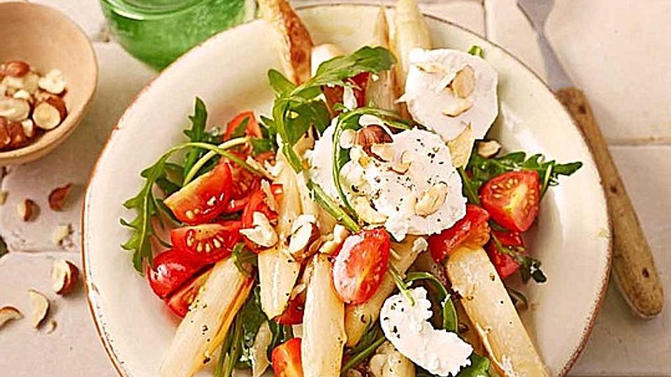 Aus restlichem Haselnussöl, Olivenöl, Essig, Salz und Pfeffer eine Vinaigrette rühren und mit Tomaten und Rauke verrühren. Auf Tellern anrichten, danach Spargel und Ziegenkäse darauf anrichten und mit den Nüssen bestreuen.