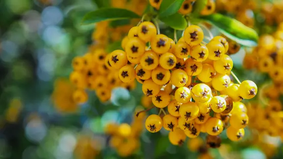 Nahaufnahme von orangefarbenen Früchten eines Feuerdorns