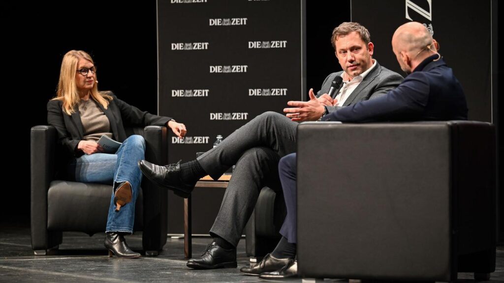 Das Gespräch mit Klingbeil fand im Rahmen der Veranstaltungsreihe Eine Stunde ZEIT des Zeitverlags in Hamburg statt. Vor Publikum stellte sich der Vizekanzler dabei den Fragen von Tina Hildebrandt, der Leiterin des ZEIT-Politikressorts, und von Roman Pletter, dem Leiter des Ressorts Wirtschaft.