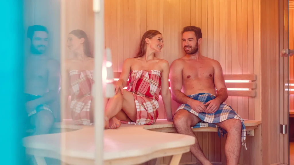 Junge Frau und junger Mann sitzen mit einem Tuch umwickelt in der Sauna.