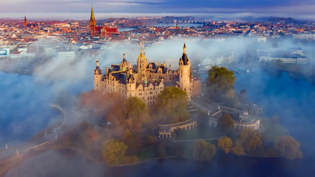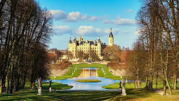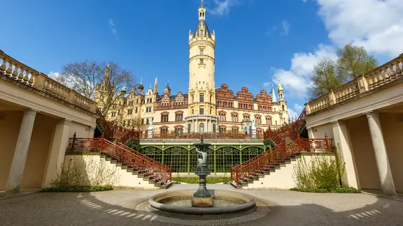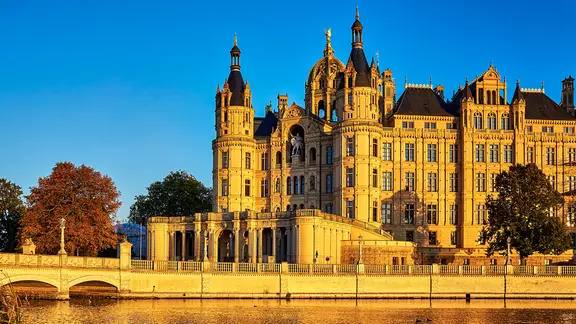 Das märchenhaft anmutende Schweriner Schloss zählt mit Teilen der historischen Innenstadt seit 2024 zum UNESCO-Welterbe. Der im See gelegene Prachtbau ist heute Sitz des Landtags und ein Museum.