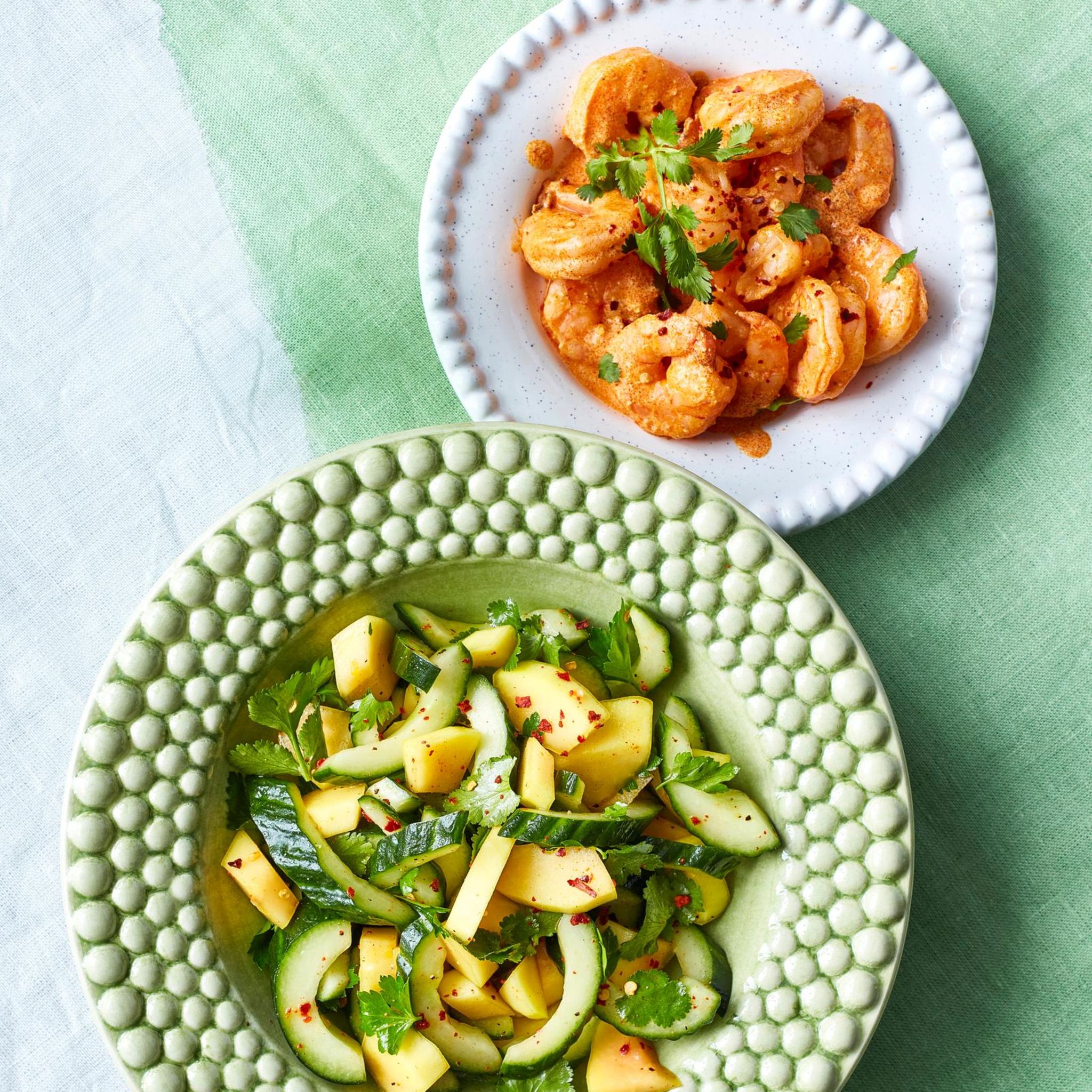 Low-Carb und im Handumdrehen zubereitet sind die würzigen Tandoori-Garnelen in Kombination mit dem erfrischendem Gurken-Papaya-Salat.
