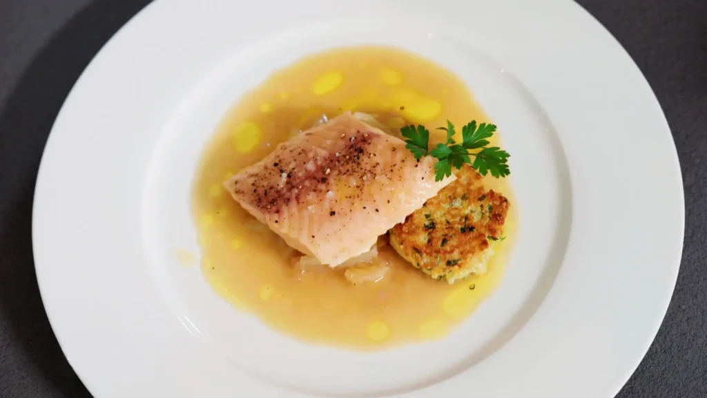 Seesaibling mit Quinoa-Puffern auf einem Teller serviert | Screenshot