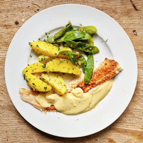 Serviert mit Petersilienkartoffeln und grünen Kefen (aus dem TK)