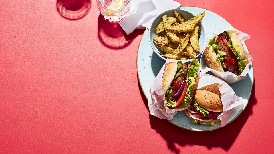 Die Burgerbrötchen halbieren. Die Unterseite mit Senf bestreichen und mit Salat belegen. Darauf die Zwiebelringe und den Burger geben. Die Oberseite mit Ketchup bestreichen und auf den Burger setzen.