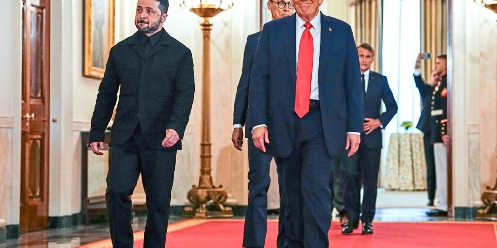 epa12308800 United States President Donald J Trump leads European Leaders through the Cross Hall of the White House in Washington, DC, USA, 18 August 2025. European Leaders are at the White House in support of President Zelenskyy following President Trump’s meeting with President Vladimir Putin of Russia in Anchorage, Alaska, USA, on August 15, 2025. EPA/AARON SCHWARTZ / POOL