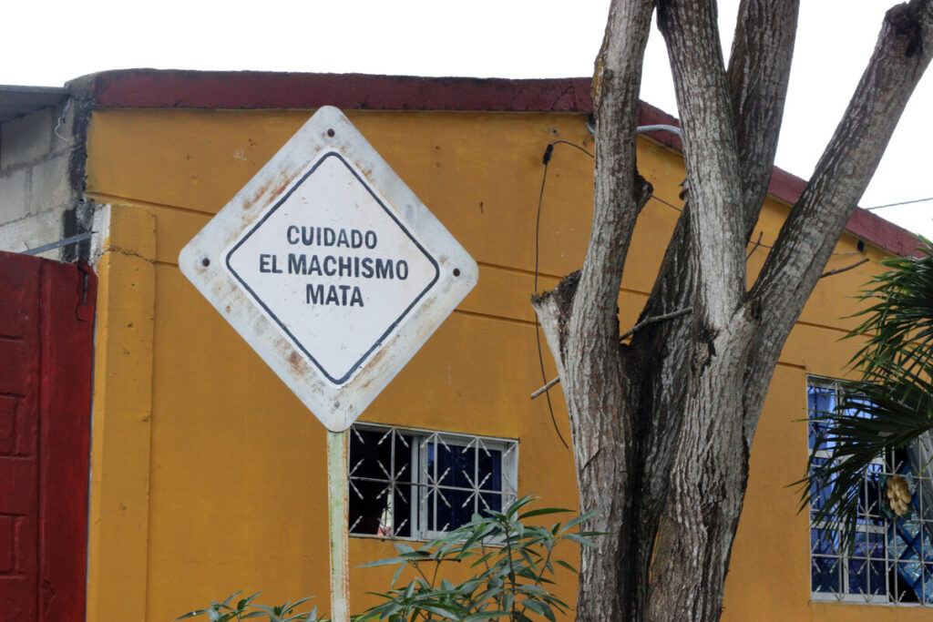 Während wir die Straße entlanggehen, schauen Kinder neugierig aus den Fenstern, immer mehr Frauen schließen sich uns an. Ein Stoppschild warnt mit der Aufschrift „Cuidado, el machismo mata“ („Vorsicht, Machismo tötet“).