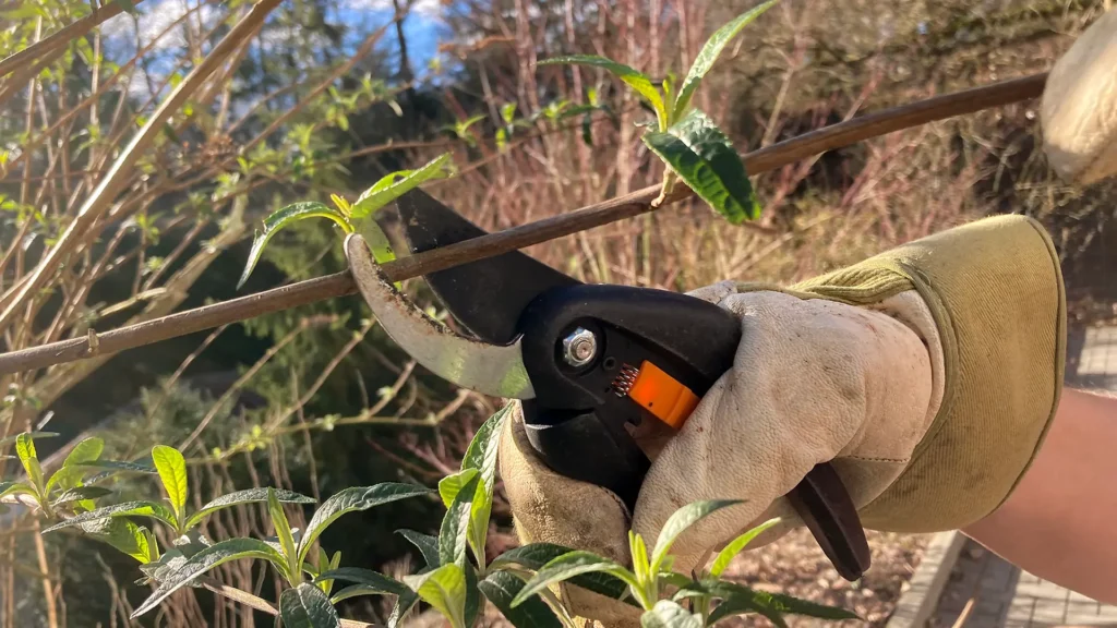 Schmetterlingsflieder sollte am besten im späten Winter geschnitten werden. Je nach Witterung kann der Rückschnitt etwa ab Mitte Februar an einem frostfreien Tag erfolgen. In milden Wintern hat der Sommerflieder zu diesem Zeitpunkt noch immer Blätter oder beginnt bereits mit dem neuen Austrieb. Das ist für den Rückschnitt aber kein Problem.