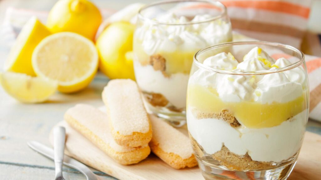 - Anschließend Dessertgläser mit Löffelbiskuits befüllen und mit dem Zitronensirup bestreichen. Als nächste Schicht etwas Zitronencreme verwenden und erneut mit Löffelbiskuits starten. Den Abschluss bildet eine Schicht Zitronencreme beträufelt mit restlichem Zitronensirup.