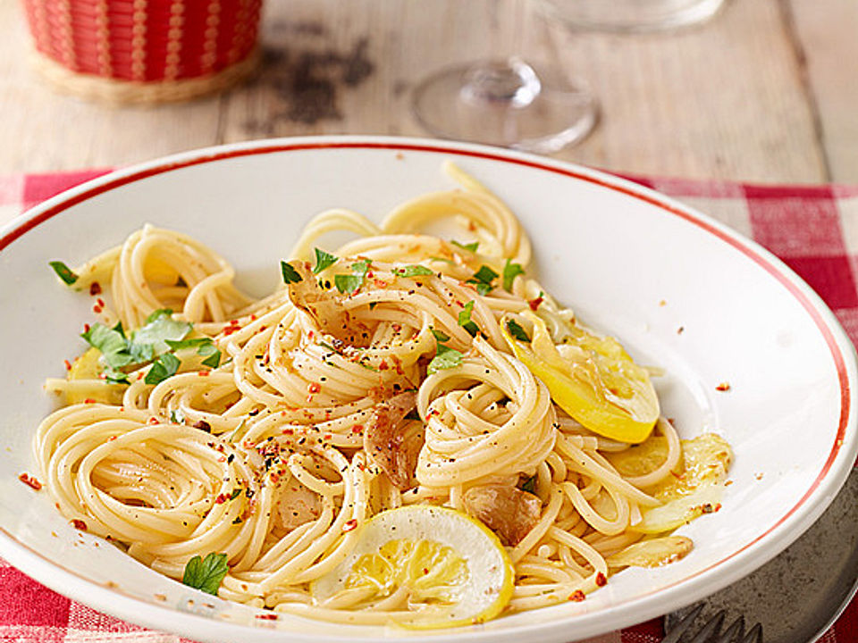 In einer großen Pfanne das Olivenöl erhitzen. Knoblauch, Petersilienblättchen und Chili kurz darin anbraten, die Zitronenscheiben dazugeben und mitbraten. Die Spaghetti dazugeben und darin schwenken. Mit Meersalz und Pfeffer würzen.