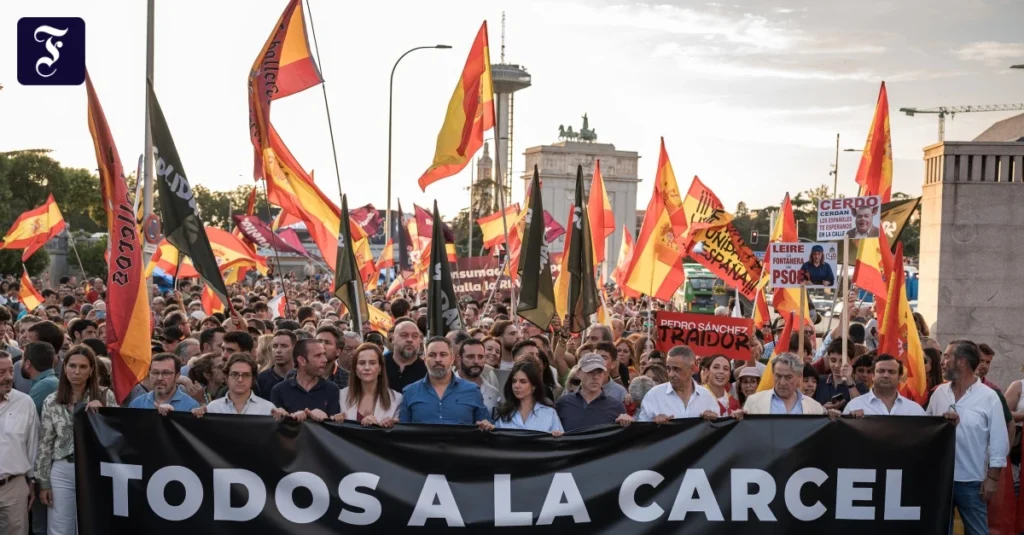 Der Vorsitzende der Vox-Partei, Santiago Abascal, im blauen Hemd inmitten von Anhängern bei einer Demonstration im Juli 2025