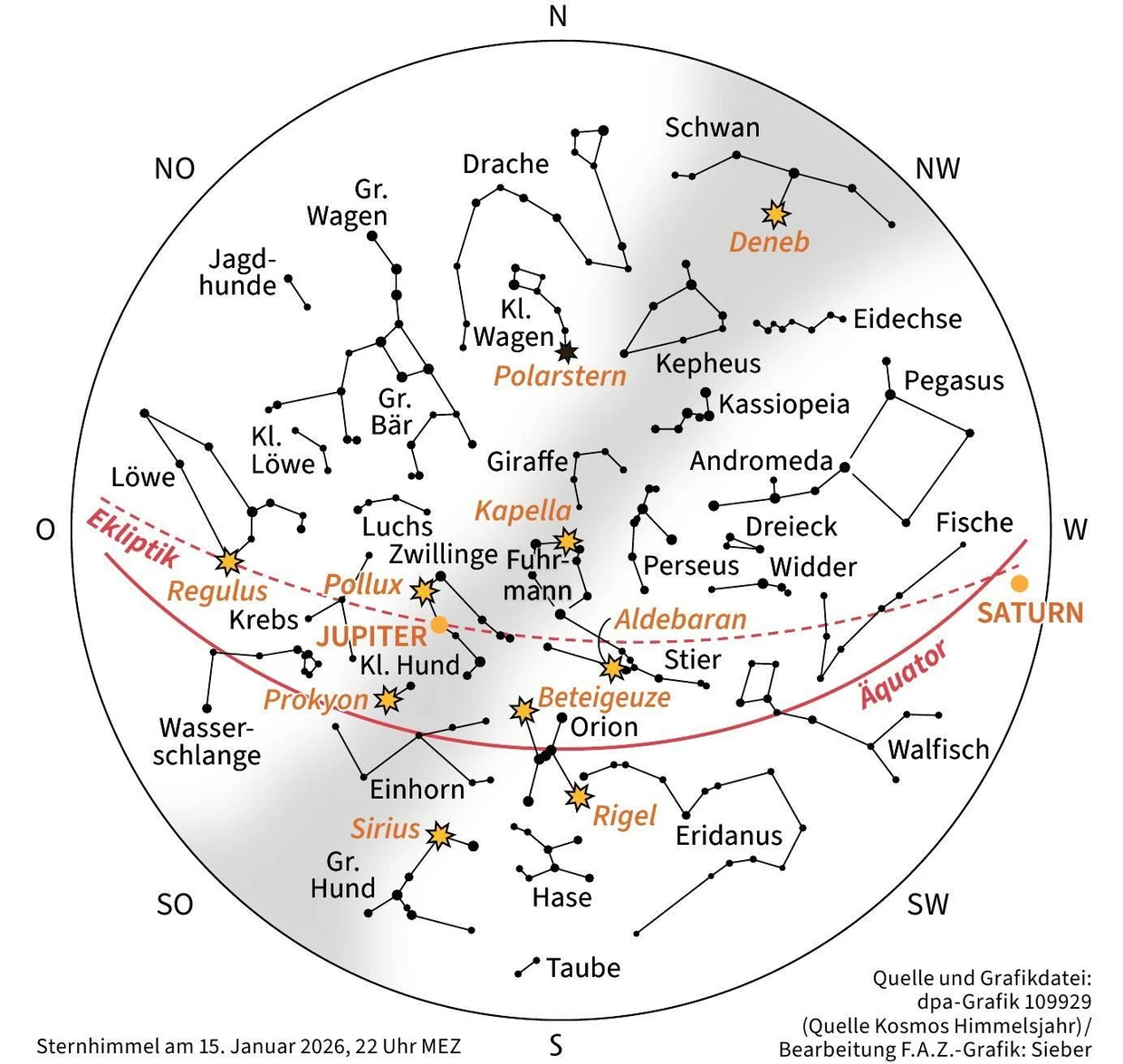 Mond: 3. Januar, 11.03 Uhr: Vollmond;10. Januar, 16.48 Uhr: Letztes Viertel;18. Januar, 20.52 Uhr: Neumond;26. Januar, 5.47 Uhr: Erstes Viertel.