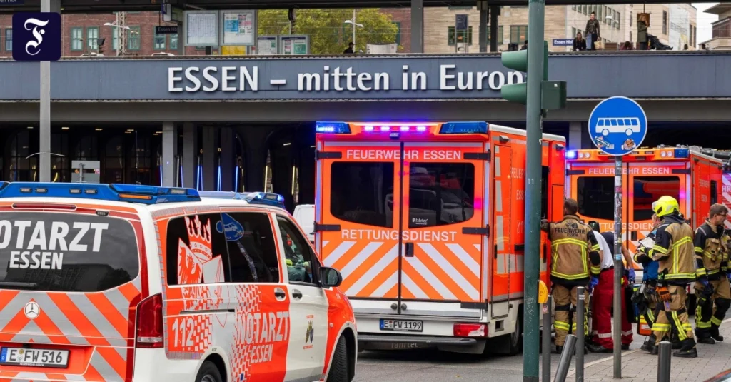 Essen: Einsatzkräfte von Feuerwehr und Rettungsdienst stehen vor dem Hauptbahnhof.