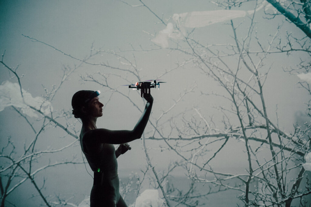 Lastivka hatte Glück. Sie wurde kürzlich in solch eine Einheit versetzt, in der ihr Potenzial erkannt wurde und in der sie unter anderem für Drohnen verantwortlich ist. Auf der Bühne des HAU2 steht eine Drohne mit einer dezidierten Meinung. Mit sonorer Stimme stellt sie klar: „Ich bin eigentlich wie ein Vogel und ich möchte keine Waffe sein.“ Auf einmal wird es stockdunkel im Saal, Agata Różycka hat sich aus ihrem Rokoko-Ballkleid einen Unterstand gebaut.