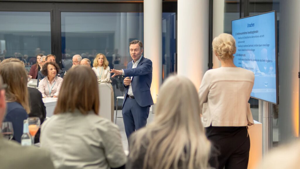Sabrina Koch von UnternehmerTUM kennt das Problem von ausufernden Gesetzen, die ihren ursprünglichen Zweck nicht erfüllen. Koch arbeitet vor allem mit Unternehmen aus dem Mittelstand zusammen. Insbesondere wenn ihre Klienten versuchen, die eigene Produktion nachhaltiger zu gestalten, sei das oft „sehr kompliziert“, so Koch. Sie wünscht sich daher mehr Freiheiten für Unternehmen. Man könnte etwa darüber nachdenken, Unternehmen probeweise von Auflagen zu befreien, wenn sie mit einem Prozess ein Ziel, wie Nachhaltigkeit, verfolgen.