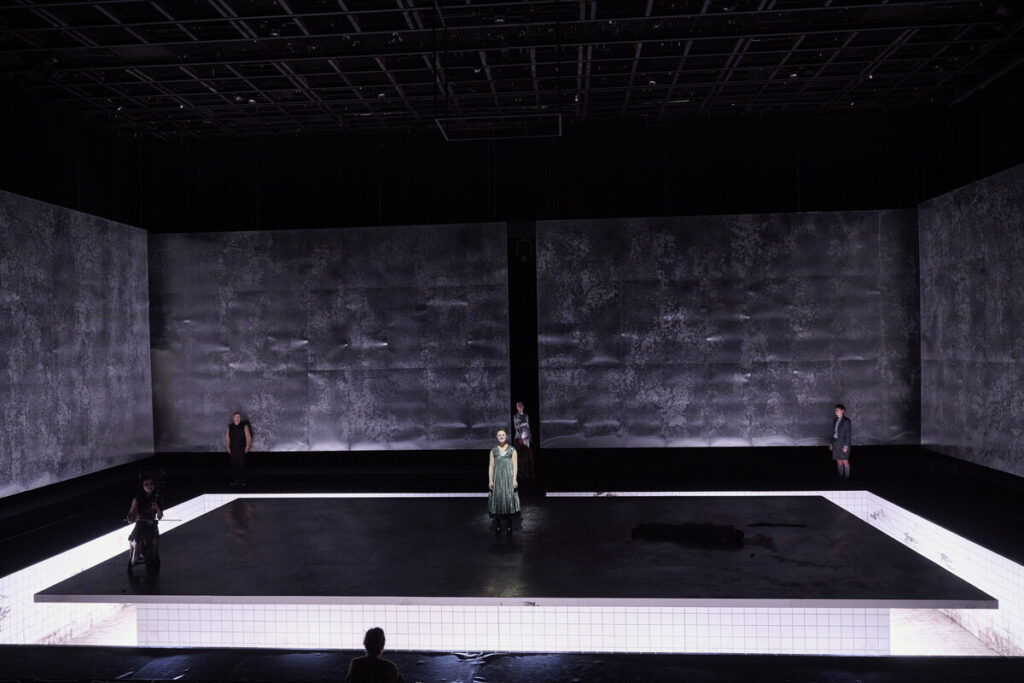 Es ist ein fantastischer, ein manischer Eröffnungsmoment dieses Berliner Freitagabends, an dem Regisseur Michael Thalheimer nach knapp zehn Jahren mit einer Inszenierung an die Schaubühne am Lehniner Platz zurückkehrt. Silbrig eingefasst ist das minimale Bühnenbild, doch das oxidierte Blech spiegelt nicht die stumpfen Augen der Figuren, nur die matten Lichter, die sich im Verlauf des Abends wenig ändern werden, schimmern darin milchig.