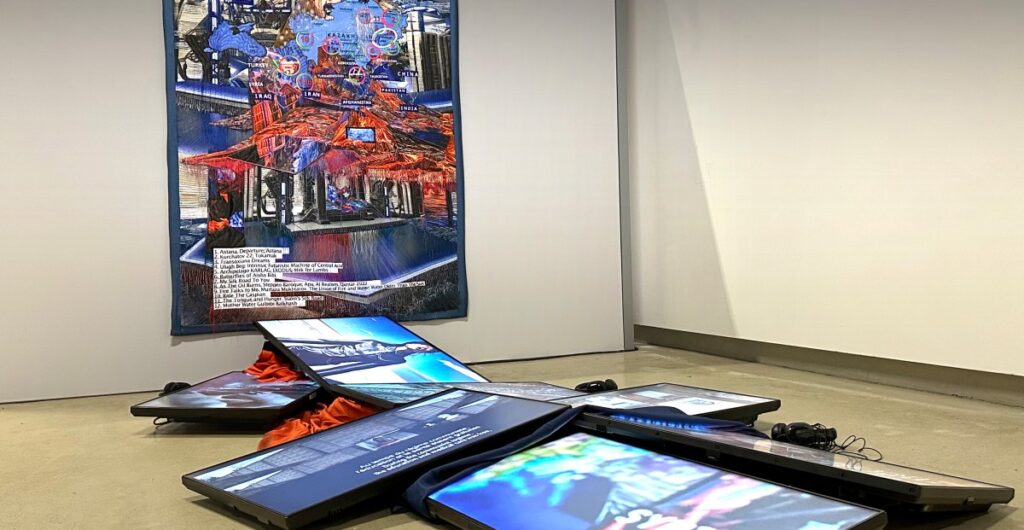 Video screens glow softly from the floor, looping footage of salt lakes, steppe villages, and decaying nuclear test sites. Suspended above them is a large handwoven textile map, crafted by artisans in Kazakhstan. The tapestry maps 12 significant sites across Kazakhstan and the surrounding region, each corresponding to one of the flickering videos below. This is Posthuman Matter: The Map of Nomadizing Reimaginings #3, the latest large-scale installation by photographer and multimedia artist Almagul Menlibayeva.