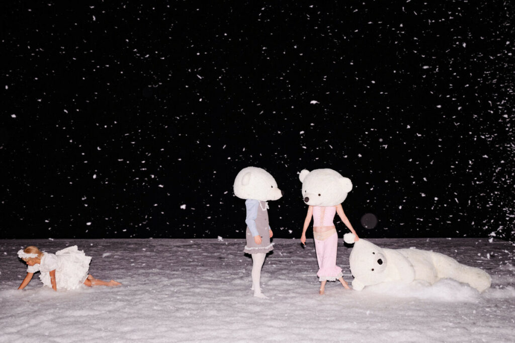 Katharina Pia Schütz hat den Garten als vereiste Ebene gestaltet. Die Spieler*innen durchqueren sie barfuß, mal rennend, mal kriechend auf allen Vieren. Manchmal fällt Schnee. Manchmal ziehen sie übergroße Bipolarbären aus Teddy hinter sich her, tragen selbst Bärenmasken.