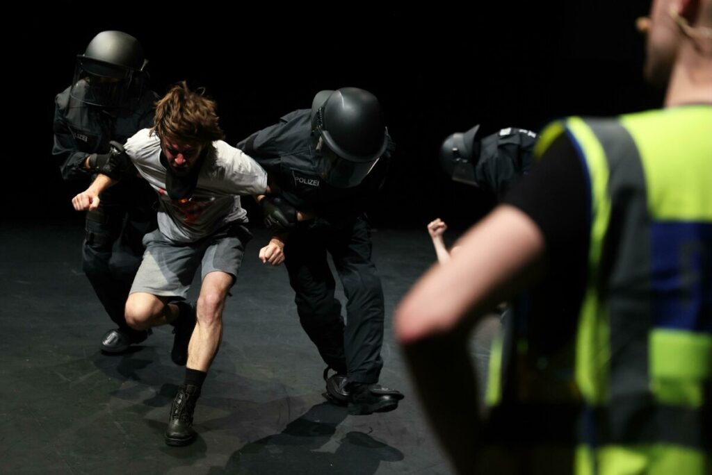 Dennoch ist die Körperlichkeit des Stücks beeindruckend: Wie die ineinander verhakten Ellenbogen, die zusammenhalten sollen gegen den mächtigeren Gegner Polizei. Der wiederum geht mit unerwarteten Reizgriffen ins Gesicht gezielt dazwischen. Sie sollen Schmerzen auslösen, ohne bleibende Verletzungen: Ohrmuschel-, Nasen- oder Kiefergriff. Dann Arm- und Handgelenksverdrehung.