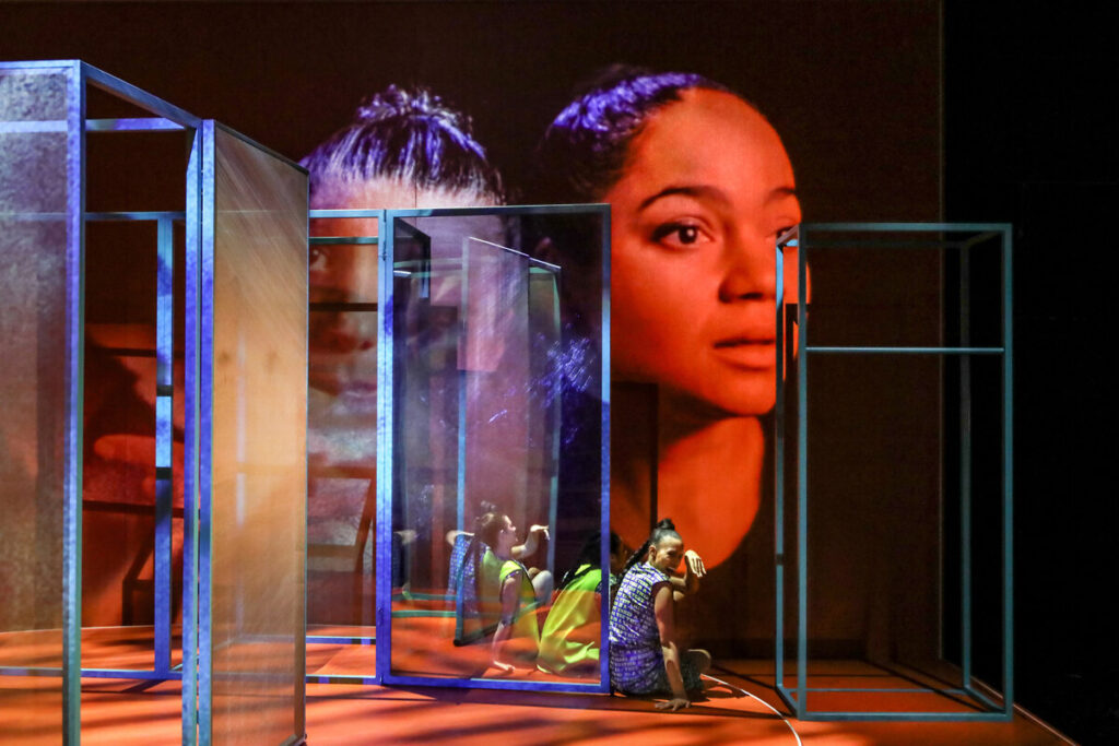Statt einzelner Gruppen rückt Miriam Ibrahimi in ihrer Inszenierung allein den Menschen in den Vordergrund. Schon ihre Kulisse (Bühne: Mitra Nadjmabadi) unterwandert alles Trennende. Wir blicken auf türkisfarbene Gerüste. Mal mit Spiegelflächen versehen, mal begehbar, symbolisieren sie aneinander befestigte Türen. Man klappt sie auf, klappt sie zu, so oder so bleiben sie transparent.